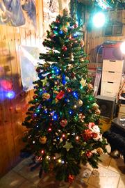 Albero di natale con struttura in metallo composto da 6 palchi con rami, testa e struttura completamente smontabile; incluso di: varie decorazioni (palle, stelle, babbi natale, stella di testa, etc.), due catene luci LED multicolore con centralina, proiettore laser animato da esterno a due colori per natale e capodanno.