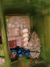 vendo albero di Natale (210cm)completo di albero sintetico apribile e direzionabile con appoggio, addobbi (palle con ganci di vari colori, figure e addobbi in punta) luci e pagliette argentate. Inoltre vendo comprensive nel prezzo anche le luci esterne a cascata bianche e a filo continuo blu. trattabile