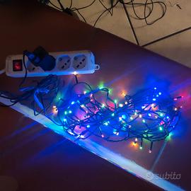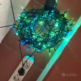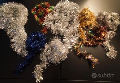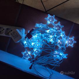 Albero sintetico alto 180 cm, con palline, festoni e luci. Le luci sono 5 fili di cui uno che funziona solo con le pile (già inserite). Uno dei fili ha qualche lucina fulminata.