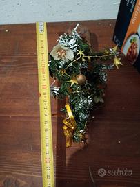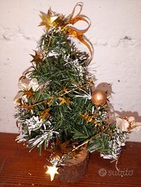 piccolo abete di natale, innevato. nuovo, mai usato, pieghevole e adattabile, decorato con fiori, palline e stelle dorate, come appoggio ha un tronchetto di legno.