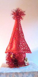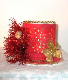 da tavolo, realizzato e decorato a mano, rifinito con cura. La colla a caldo è stata usata solo per piccole rifiniture esterne, mentre per tutto il resto sono state usate colle specifiche a seconda del materiale trattato, il che rende l'oggetto molto più solido. Il portabottiglie è composto da due parti che si possono usare anche separatamente. La base come porta bottiglia o porta bon-bon, e il ''cappello'' come alberello a sé. Un modo diverso di avere l'albero di Natale piccolo, ma anche un originale porta bottiglia per decorare il tavolo delle feste. Pezzo unico. Misure: base15cm interno 8,50cm, adatto a bottiglie di vino. Ritiro a mano dintorni Tuscania, Viterbo, Canino (Vt) e a volte a Roma. Possibile spedizione