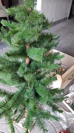 Vendo albero di natale con base in legno, altezza 180cm; l'albero viene venduto completo di vari addobbi (palline, striscioni e luci ad intermittenza) come da immagini.