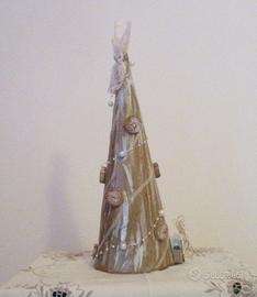 da tavolo, completamente realizzato e decorato a mano in stile shabby chic, rifinito con cura dei dettagli. Alcuni elementi decorativi sono fatti e/o cuciti a mano. La parte esterna della base è rivestita con materiale impermeabile che non riga la superficie di appoggio.Sono stati utilizzati vari tipi di colle a seconda dei materiali,il che rende l'oggetto molto più solido,e la colla a caldo è stata usata solo per piccole rifiniture esterne.Rifinito con flatting. Il filo di luci, a tre posizioni, è compreso, e il cappello dell'albero ha una taschina in cui riporre la base. Il portabottiglie è composto da due parti che si possono usare anche separatamente. La base come porta bottiglia o porta bon-bon, e il cappello come alberello a sé. Un modo diverso di avere l'albero di Natale piccolo, ma anche un originale porta bottiglia/albero di Natale per decorare il tavolo delle feste.