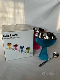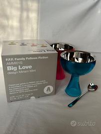 Coppe per gelato o macedonia Big Love di ALESSI design Miriam Mirri in Polimetilmetacrilato con ciotola e cucchiaini in acciaio inossidabile 18/10. Nuove nella confezione originale. Vendibili anche singolarmente. Altezza cm 15 - Diametro cm 16 - 50 euro cad