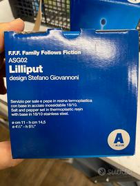 Alessi sale e pepe lilliput , design di Stefano Giovannoni , in resina termoplastica con base in acciaio inossidabile 18/10 , nuovo con sua confezione , originali da mettere a tavola