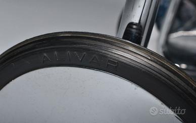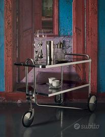 ALIVAR Carrello 149 design Marcel Breuer 1930. ECCELLENTE STATO. Da ESPOSIZIONE Prezzo al dettaglio 4300 eu. In OFFERTA a : 2950 eu ------------------------------------------------------------------ Carrello serie ALIVAR MVSEVM 149 con struttura in tubolare d'acciaio cromato. Piani in laminato pressurizzato in color nero. Struttura in Tubolare piegato a freddo (18 mm ) in acciaio inox cromato a specchio, ruote con protezione in gomma nera antiscivolo. Il carrello di servizio Breuer apparve per la prima volta con ruote a razze nel catalogo Thonet del 1930-1931 (B54). Con ogni probabilità, fu messo in produzione nel 1930. Il carrello con tre ruote a disco è stato mostrato nel 1930 al Salon des Artistes Decorateurs nel appartamento per un albergo della pensione di M. Breuer, che faceva parte della mostra Deutscher Werkbund in visita. Fu anche esposto nel 1931 al Bau-Ausstellung di Berlino nella "Casa dello sportivo" di Breuer. Nel catalogo Thonet del 1932, il carrello a tre ruote è stato sostituito da una versione modificata a quattro ruote identificata come B54/4. Questo carrello non è attribuito a Breuer. Il carrello non è più presente nel catalogo Thonet del 1935-1936. Tuttavia, il carrello a tre ruote appare nelle fotografie del 1936 dell'appartamento londinese (Highgate) progettato da Breuer e Francis Reginald Yorke per la signora Ventris. Per ricerche di archivio, la produzione attuale è l'unica dopo la produzione originale di Thonet . Lunghezza : 110 cm Larghezza 51 cm Altezza t: 80 cm