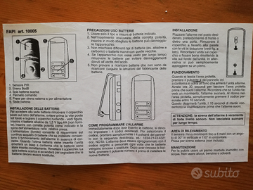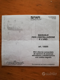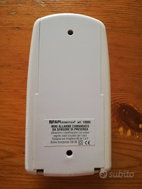 Mini allarme FAPI Domotica comandato da un sensore di presenza attivazione e disattivazione con codice segreto. Funzionante con pile e a corrente sempre con pile inserite.