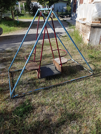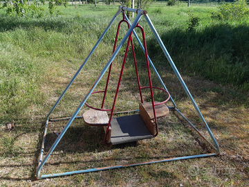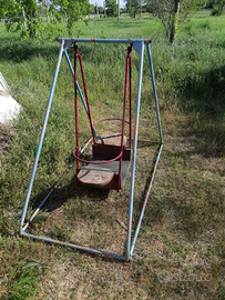 Bella e sana altalena per bambini in ferro, a due posti contrapposti con pedana centrale, di colore rosso, col suo castello in ferro di colore azzurro, funzionante. Il castello ha la predisposizione coi fori per essere ancorato saldamente al terreno. Le sedute sull'altalena sono in legno. Anni 60-70.