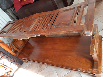 Rarissimo pezzo di epoca coloniale: una panchina che si trasforma in altalena. Interamente realizzata in legno massiccio di teak e decorata con preziose piastrelle di maiolica . Ai lati presenta quattro ganci in ottone che servivano per poterla appendere.