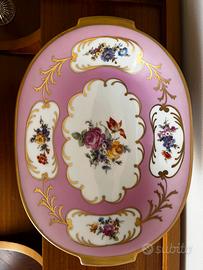 Alzatina in rosa confetto con dettagli e bordi in oro zecchino e fiori colorati.