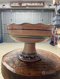 Bellissima alzata da centro tavola in ceramica smaltata dipinta a mano, proveniente da Deruta (come indicato dalla firma sul fondo). L’interno della coppa è decorato con una scena di frutta estiva (fichi, ciliegie, foglie) su fondo avorio, eseguita con pennellate vivaci e precise in stile tradizionale umbro. I bordi sono mossi e leggermente ondulati, impreziositi da una fascia con motivi vegetali blu cobalto su fondo crema, ripresi anche sulla base.