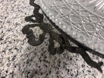 I tratta di un piatto da portata o un'alzata per torta in stile vintage, caratterizzato da un piatto di vetro intagliato con un motivo decorativo circolare, posizionato su un supporto di metallo scuro decorato. Diametro 30 cm , altezza 7 cm