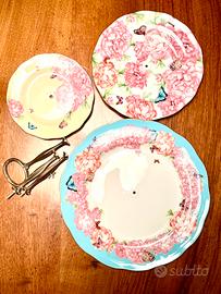 Alzata per torte in fine porcellana della famosa casa inglese ROYAL ALBERT dipinta a mano con bordo in oro, collezione Miranda Kerr motivo floreale con farfalle, mai usata altezza 35 cm circa