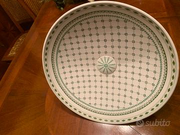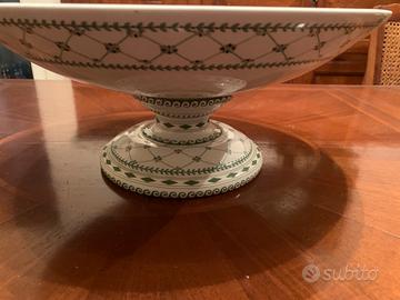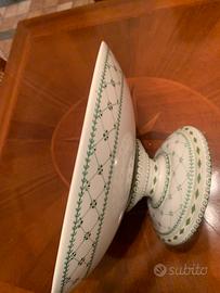 Splendida alzatina/centrotavola in porcellana firmata Villeroy & Boch Vintage con raffinata decorazione. "Mangani Firenze". Epoca fine ‘900 Un pezzo elegante e senza tempo, ideale per impreziosire la tavola o come elemento decorativo per ambienti classici e country chic. La linea armoniosa del piede e il delicato motivo geometrico verde la rendono perfetta per servire dolci, frutta o come oggetto d'arredo. Decorazione: Mangani Firenze