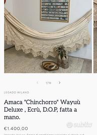Vendo pezzo unico nuova meravigliosa amaca fatta a mano con materiale pregiato, realizzata artigianalmente in Venezuela. Matrimoniale 360x240. Allego immagine di costo approssimativo di queste amache realizzate a mano. Pezzi unici di arredamento. Vendo 80 euro. Ganci al muro non inclusi