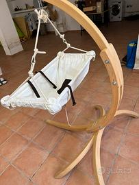 Kaya è appesa meravigliosamente in Carrello Baby, la struttura per amaca meravigliosamente curva realizzata in legno di abete non trattato. Il design esclusivo rende Carrello un vero gioiello in casa o in giardino
