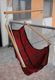 Amaca sedia in tessuto, corda e legno, si può utilizzare all'interno, sul terrazzo (agganciata al soffitto, gancio non compreso), all'aperto (legandola ad un ramo). Taglia unica. Seduta con due tasche.