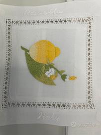 Finissimo tris da cucina ,in cotone ricamato a mano mada in italy , composto da 1 asciughino “AMALFI” 50 x35 cm rifinito con ricamo “italy” nel angolo in alto a sinistra .