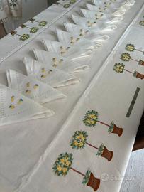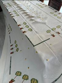 Finissima Tovaglia in Lino Italiano interamente ricamata a mano ,con colori e sogetti tipici amalfitani, finemente rifinita con punto gigliuccio