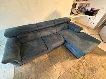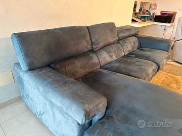 Vendo ampio divano scamosciato con poggiatesta reclinabili e chaise longue posizionabile sia sul lato destro che su quello sinistro, tessuto facilmente smacchiabile . Ottimo per serate in compagnia o per momenti di relax grazie alla chaise longue confortevole .