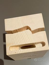 Amplificatore acustico passivo (senza alimentazione) in legno recuperato dalla tempesta Vaia (Dolomiti, 2018). Migliora la diffusione del suono tramite cassa di risonanza naturale.
