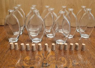 Vendesi in blocco Nuove Ampolle di vetro di diversa capienza: nr. 3 da ampolle 20 cl (centilitri), nr. 3 ampolle con braccino da 10 cl, nr. 14 ampolle da 10 cl, e 13 ampolle da 4 cl. T. Tutte le ampolle sono dotate di tappo in sughero.