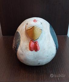 L'anatra è scolpita in legno massiccio ed è un prodotto artigianale, dipinta a mano, con dettagli che includono piume bianche e nere, un becco giallo e una decorazione rossa sulla testa e intorno al collo.