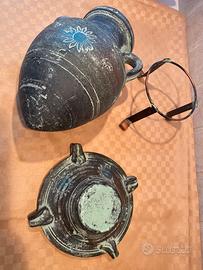 Complementi di arredo Anfora a spirale con ciotola etrusci con disegni sopra, altezza anfora 29 cm e largo 20 cm, ciotola altezza 7 cm e diametro 18 cm, in ottime condizioni