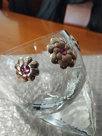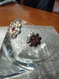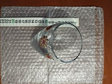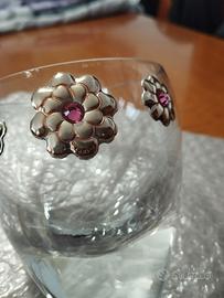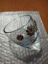 Soprammobile/Portagioie in cristallo con fiori di lamina d'argento (certificati) e brillanti rosa.