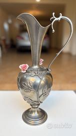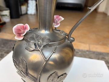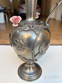 grande anfora in peltro cc 95%, anni 70, con piattino di appoggio, lavorazione a mano pesante e lucido, con decorazioni rami e foglie dello stesso materiale, con 2 fiori in ceramica, altezza totale 46 cm circa, con manico, e biglietto originale di produzione.