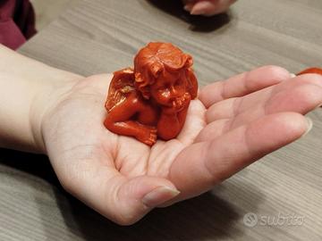Angioletto portafortuna realizzato artigianalmente in pasta di corallo rosso con ali con finitura dorata. Piccole imperfezioni sono testimonianza della lavorazione fatta a mano.