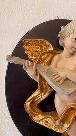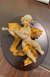 Delizioso angelo in resina con mandolino, posizionato su una base.