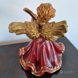 Statuetta decorativa raffigurante un angelo musicante con liuto, in resina dipinta a mano con finiture dorate.