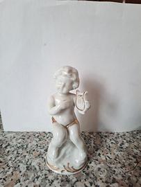 Delizioso angioletto in ceramica bianca, con dettagli dorati, raffigurato mentre suona una lira. Altezza circa 10 cm.