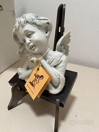 Scultura in porcellana articolo da collezionismo, raffigurante un angioletto (o figura angelica) dipinta a mano, su base di legno con etichetta firmata