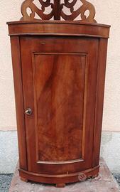 Vendo bella angoliera (cantonale) in noce con antina bombata, due ripiani all'interno e due ripiani nell'alzata superiore decorata con intagli traforati.