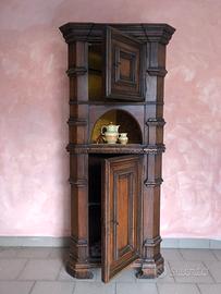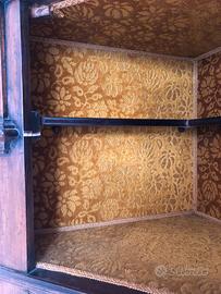 Mobile rustico angoliera in legno massello foderata in velluto broccato giallo ocra. Tenuta benissimo (i buchini NON sono tarli, sono finti per dare l’aspetto rustico) H 185 L 80 cm. Epoca anni ‘70. Le due parti, superiore e inferiore, sono separabili.