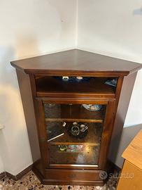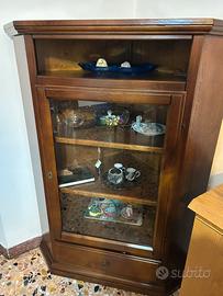 Angoliera con vetrina in abete, color noce. Altezza 1.38m, larghezza 1.02m, lati 72.5 cm