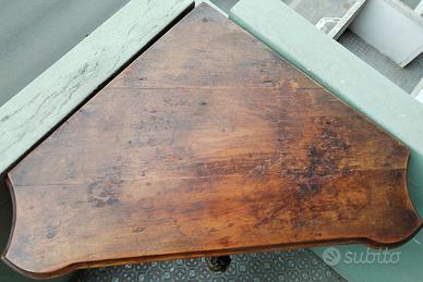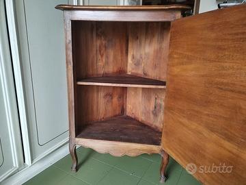 RIPIANO E PARTE ANTERIORE DELLA ANGLIERA SONO FINEMENTE INTAGLIATI A SAGOMA , L'ANTA è DECORATA CON INCISIONI E POMELLI , CHE IMMITANO UNA CASSETTIERA ,GAMBE A CAPRIOLLA E PIEDINI ZOOMORFI .