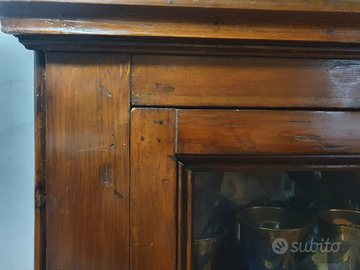 Angoliera della fine dell'800 con parte alta a vetrina e parte bassa chiusa. Anta unica. In ottime condizioni Misure: il frontale e' 80 cm i due lati dell'angolo 60 cm altezza 184 cm