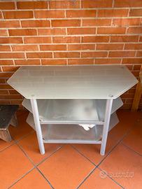 Angoliera in vetro satinato e acciaio a 3 ripiani. La usavo come porta tv.