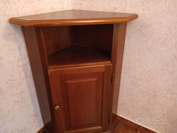 Mobiletto ad angolo con finitura in legno, dotato di n. 1 anta con pannello centrale e n. 1 vano a giorno. Chiusura magnetica. Maniglia a pomello.