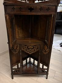 Angoliera in legno, ottime condizioni. Nella parte superiore ha un ripiano con dietro due specchi, sotto ha una vetrinetta e un ultimo ripiano in basso.