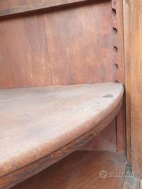 Angoliera in noce fine 800. L'angoliera è in noce massello. La porta chiude correttamente . Poco restauro da fare . All'interno è dotata di una cremaliera con due ripiani da posizionare a scelta . Dimensione : Angolo 60 x 60 x 115 h