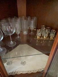 Angoliera/ cristalliera in legno noce con ripiani in vetro.