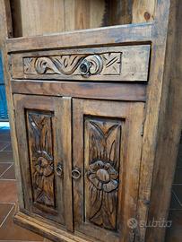 Vendo Angoliera in Stile Etnico in legno massello con incisioni artigianali in Buonissimo stato con 2 sportelli dalle ante ugualmente incise, ideale x rustici o per esposizione oggettistica