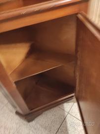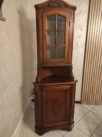 vendo angoliera in legno di noce in stile antico neorinascimentale con vetrinetta sopra con chiave e sotto un mobiletto con chiave ha un buco dietro per fare passare dei cavi ma si può aggiustare vedi ultima foto