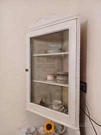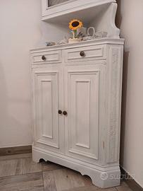 Come da titolo si vende Angoliera shabby chich in buone condizioni generali; come si può notare in foto, presenta delle imperfezioni nella fodera interna dovute all'uso, forse un po' troppo abbondante, di colla vinilica per l'applicazione della stoffa.