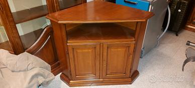 Angoliera porta TV come in foto. Ripiano a giorno per decoder, ante chiuse per conservare. Legno di noce. Misure: 72x72x85 h Da ritirare a Trani