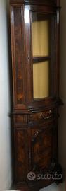 Caratteristiche: È un mobile ad angolo con una porta vetrata curva, un ripiano interno e un cassetto inferiore con maniglia in bronzo o ottone.